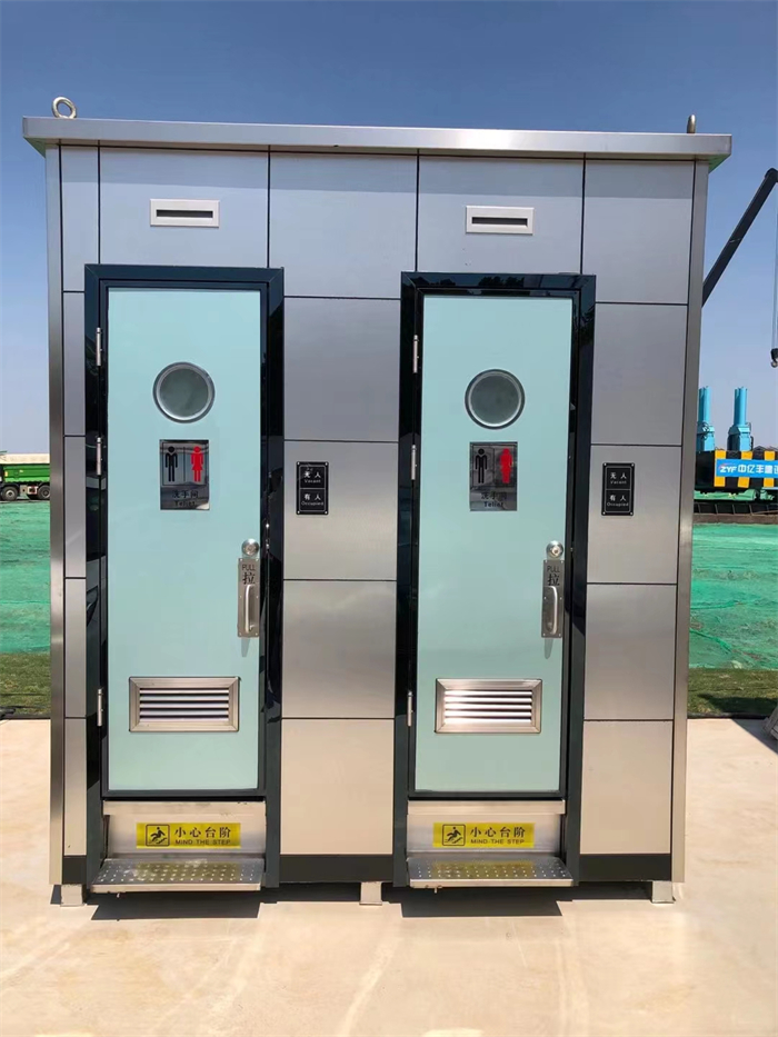 产品名称:豪华连体移动厕所(气冲座式)型号:YJDT-039、040产品说明房体规格长2400mm;宽2000mm;高3000mm;(2厕位)长4000mm;宽2000mm;高3000mm;(3厕位)占地面积4.8平方;总重量2000KG;(2厕位)占地面积8平方;总重量3000KG;(3厕位)排污方式暂存控制方式手动水冲电源电器220V16A航插,外接电源至电箱系统,磁性接近开关,顶部设照明LED灯主要设施304不锈钢蹲便器、衣帽钩、手纸盒、排风扇、扶手、一体式台盆、多功能化妆镜标志牌男女通用不锈钢标志通风前门设置百叶窗,后墙安装排风扇,使厕内空气对流门304不锈钢包边门(防水、防晒、隔热保温、耐腐蚀)装卸方式支持5吨铲车,8吨吊车。