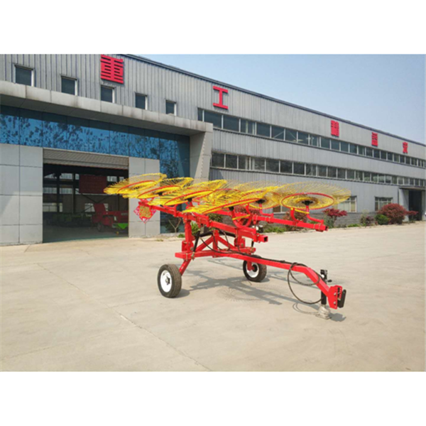 指盘式搂草机,其独特的液压机械装置可以使搂草机在几秒钟之内从运输状态转移到工作状态。运载弹簧系统在合适的压力下可以使搂草轮适应任何形式的地面环境而不影响牧草的质量。中间的液压控制搂草轮可以把牧草搂到中间的位置,当然还可以通过手动选择装置调节搂草的宽度。
