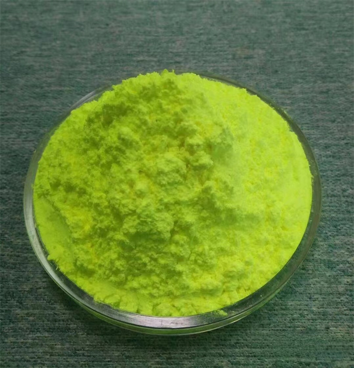 性质:黄色或者绿色结晶粉末,熔点360度左右,分解温度450度以上,色光为蓝紫光,性能稳定,最大吸收光谱波长为374nm,具有强烈荧光,发射波 长为434nm。